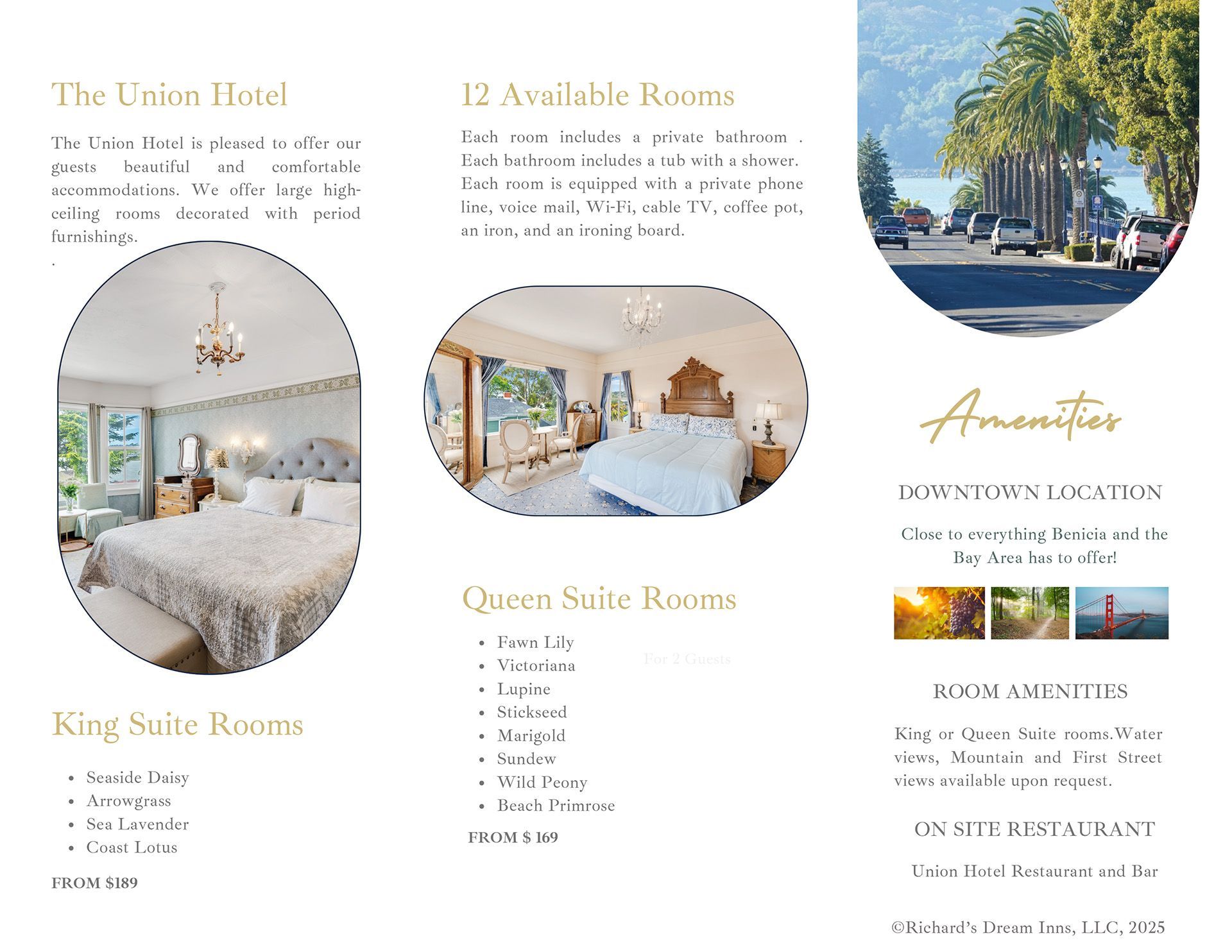 Step inside The Union Hotel and experience the perfect blend of history and modern convenience. Our thoughtfully restored spaces highlight timeless architectural details, while each room is equipped with the essentials you need for a truly relaxing stay. From cozy beds and private bathrooms to complimentary Wi-Fi and in-room conveniences, every element has been carefully considered to make your visit effortless and memorable. Whether you’re unwinding after a day of exploring Benicia or preparing for tomorrow’s adventures, you’ll find comfort, charm, and convenience woven into every part of your stay.